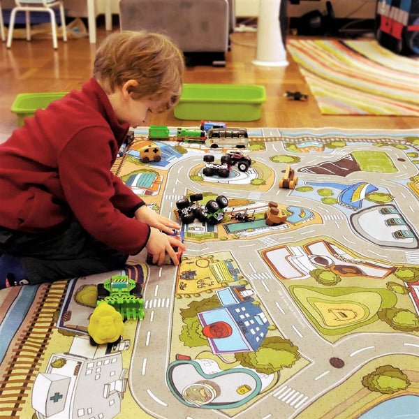 Le bonheur playmat features three-dimensional graphics. From 3 years old, children begin to develop greater spatial awareness and each element of our playmat will tell a story and stimulate the imagination.